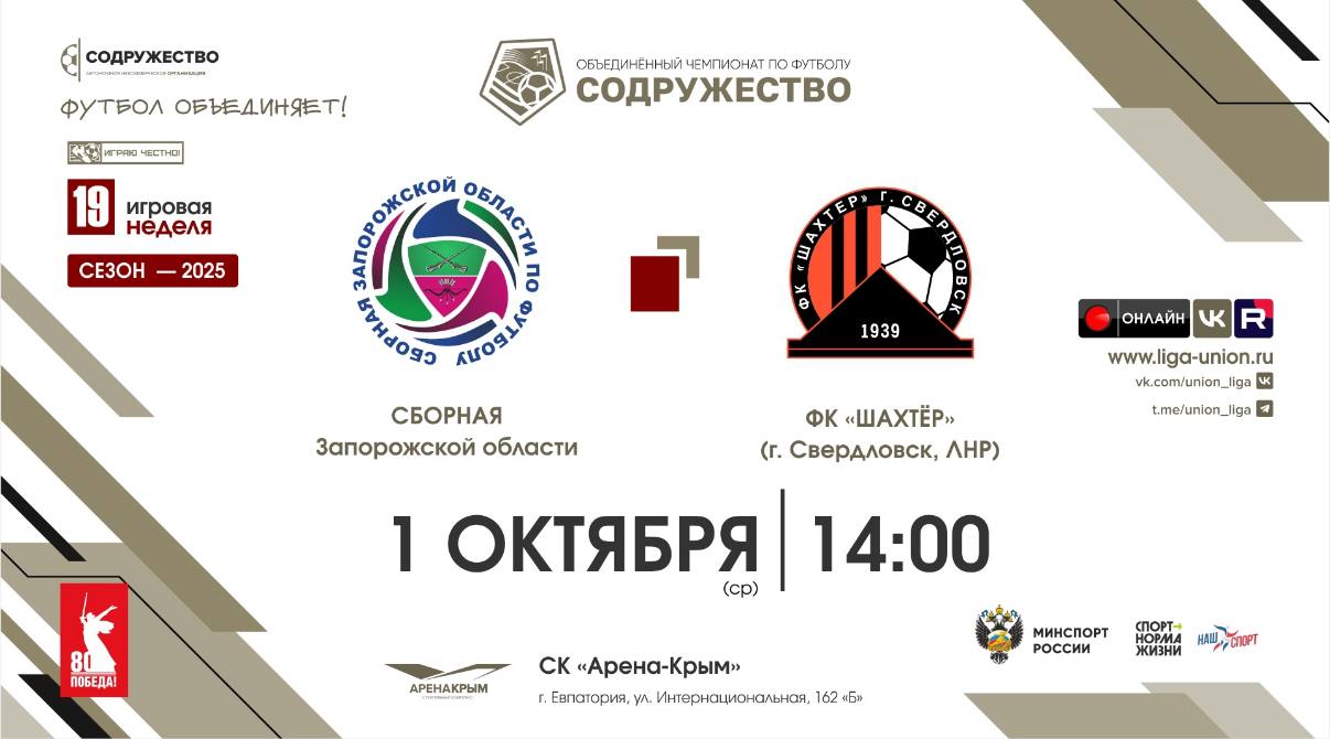 Сегодня, 1 октября, в 14:00 в Евпатории состоится футбольный матч! На поле встретятся сборная Запорожской области и команда ФК «Шахтёр» из Свердловска (ДНР).