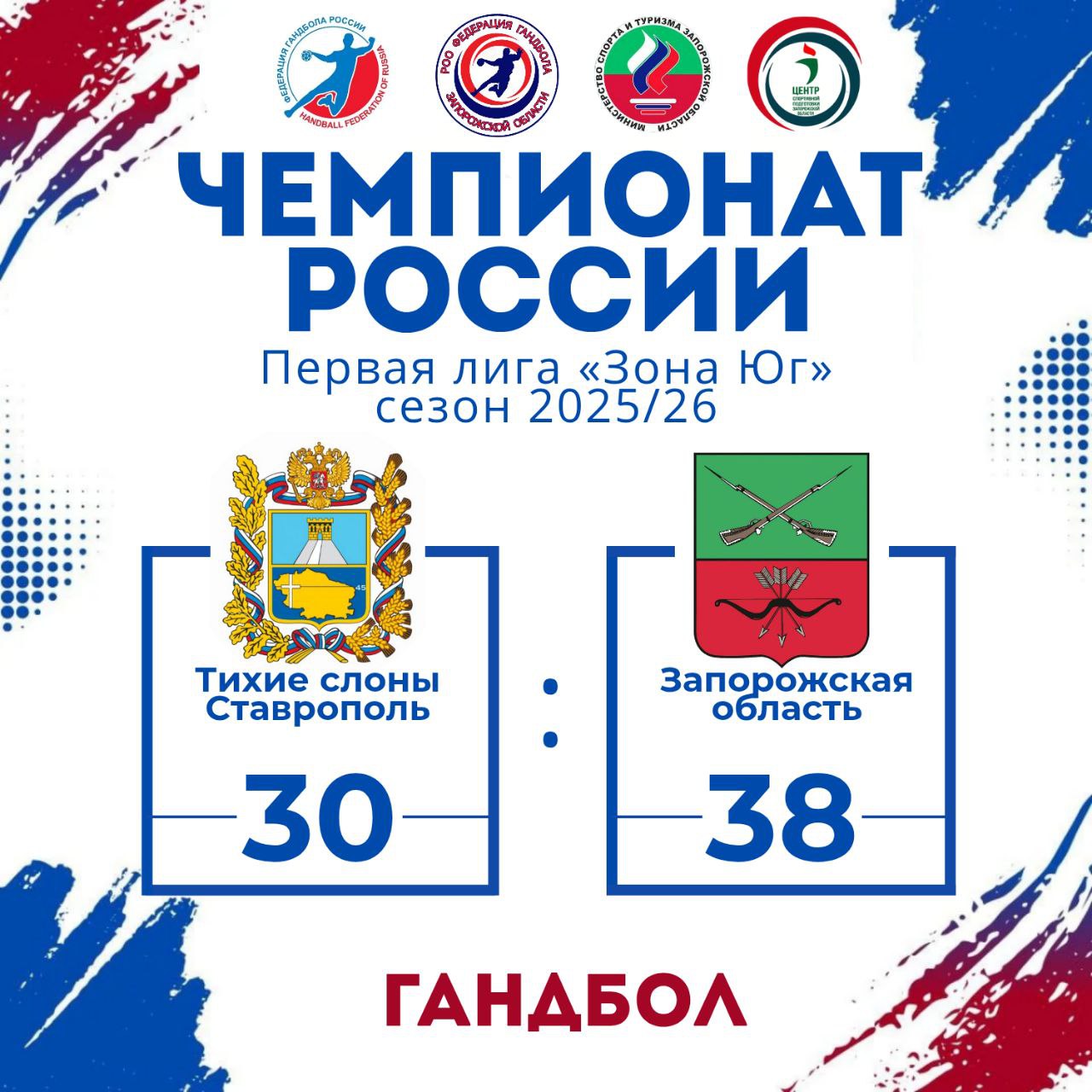 Сборная Запорожской области по гандболу вчера провела свой первый матч в рамках Чемпионата России и уверенно победила команду «Тихие Слоны» со счётом 30 : 38
