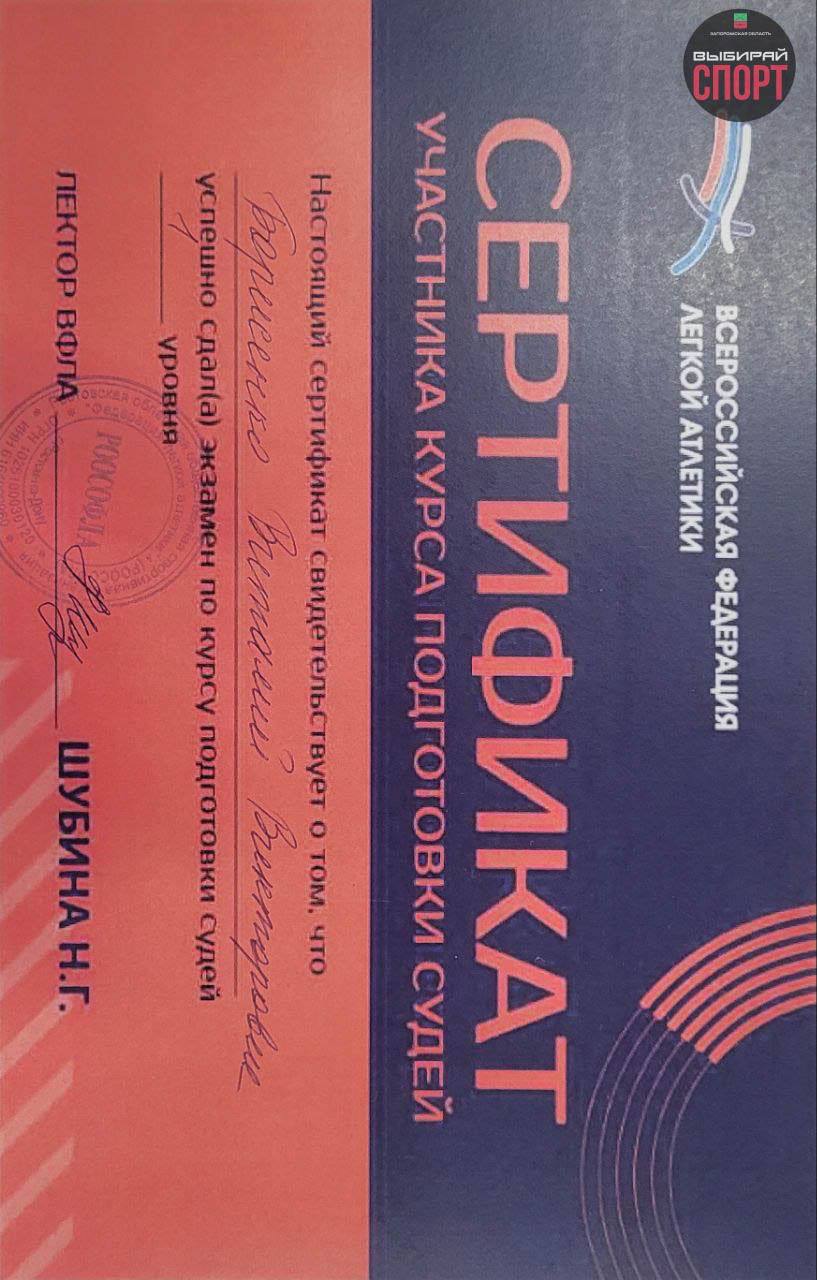 Кроме того, в рамках соревнований были организованы курсы по подготовке судей. Главный тренер Запорожской области по легкой атлетике Борисенко В.В. успешно сдал экзамен и получил соответствующую квалификацию.